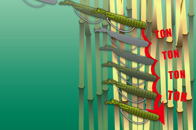 在攻略覆蓋物深處或陰影的結構時,後滑軟蟲是不可或缺的。非淺角度的後滑,而是適度角度的後滑動作,更容易感受到魚咬鉤的訊號。如果在第一次下落時沒有咬鉤,則反覆上提和再次下落的動作是基本操作,能夠多次攻擊結躲藏魚的構物。通過熟練操作這個動作,可以改變垂直結構的範圍進行攻略,並且能模擬魚餌在牆壁或蘆葦邊緣進行挑逗,從而誘發咬合。