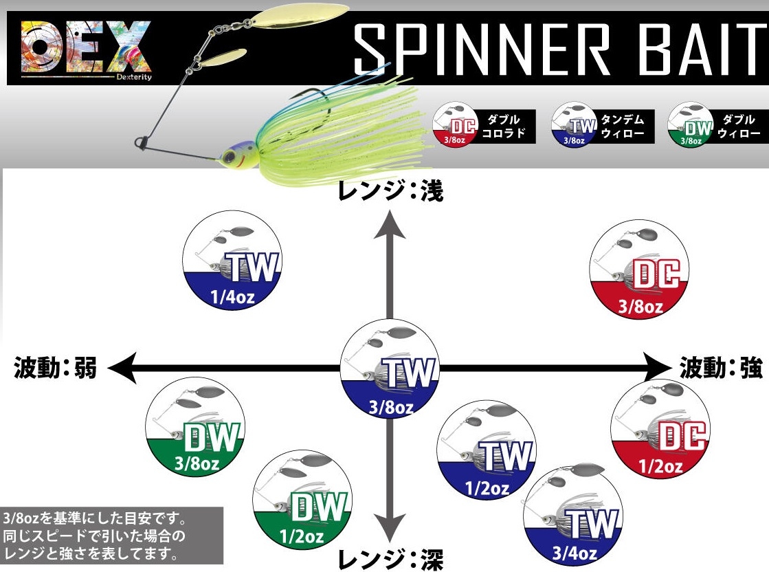 DEX系列採用高感度耐用的形狀記憶鈦金屬, 所有Spinnerbait的亮片組合, 對應各種不同的釣場環境及狀況