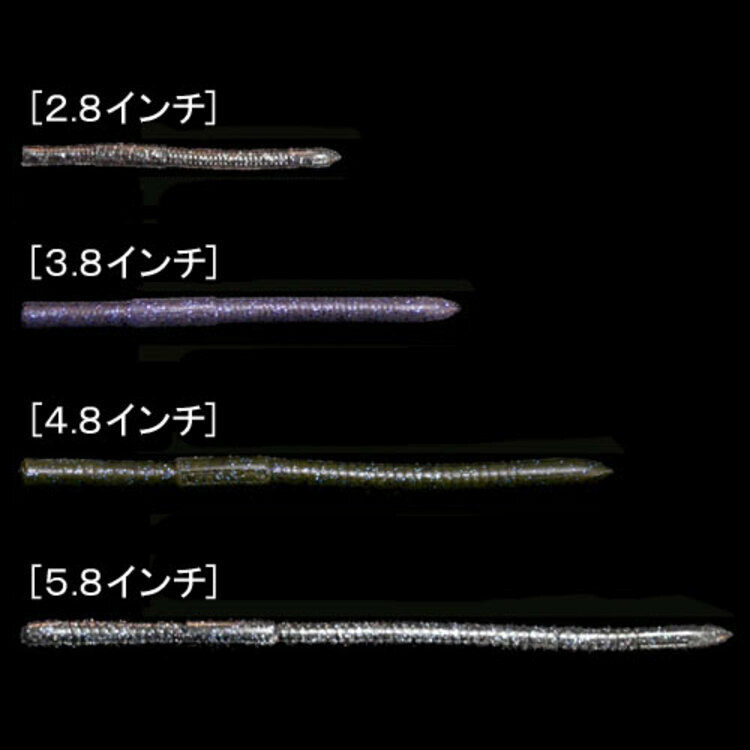 3.8 吋 適合倒吊釣組(Down Shot)、尼克釣組(Neko Rig,日文的稱呼是貓尾巴釣組,類似貓尾巴的輕微抖動