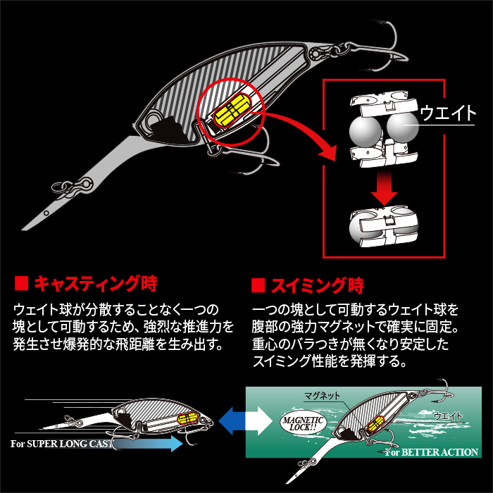 通過腹部強大的磁性確保重心移動球作為一個整體可移動。消除了重心的變動,實現穩定的游泳性能。