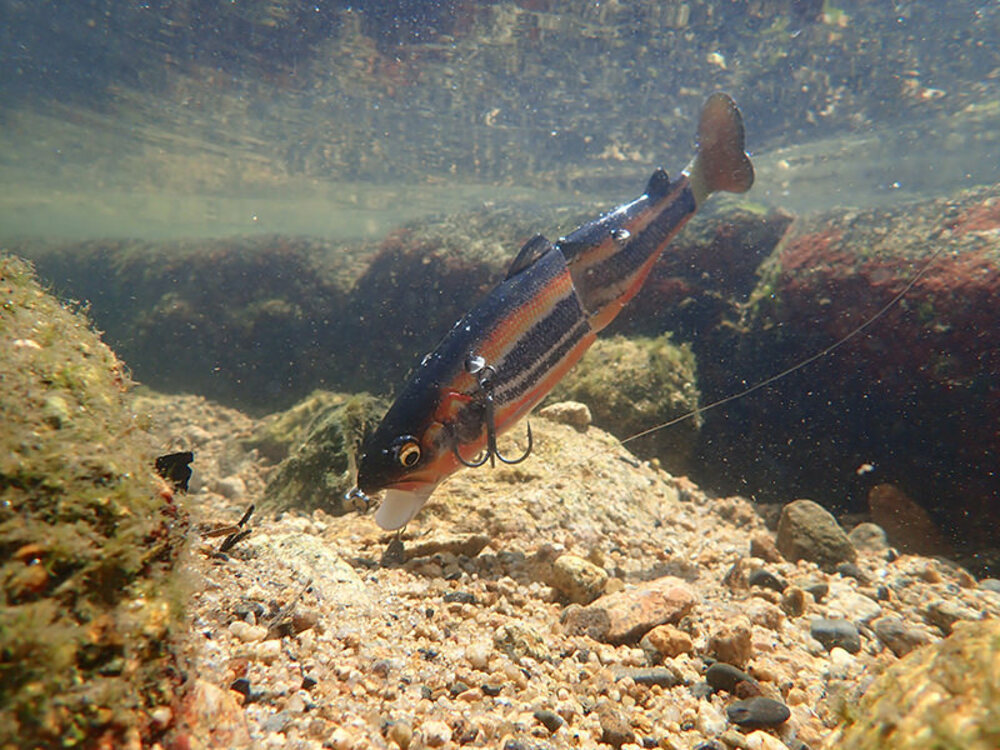 魚鉤設置於路亞側面,與路亞的本體融為一體,使目標魚不易察覺魚鉤的存在。此外,由於是自由懸掛狀態,鉤子更容易被魚吸入口腔內,即使是威嚇、驅趕性的咬鉤也能高效著鉤。鉤子位設於魚體頭部稍後的區域,是目標魚攻擊的主要部位,提升上鉤成功率。