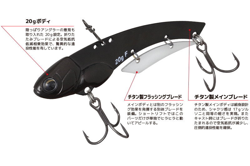 設計師將主體設計的更加纖薄,並在腹部處加入一個分離的鈦製亮片,不僅可以增強短抬竿時對魚的吸引力,還可以降低投擲時VIB的空氣阻力,並且與增加至20克的重量相互作用,發揮壓倒性的遠投性能。