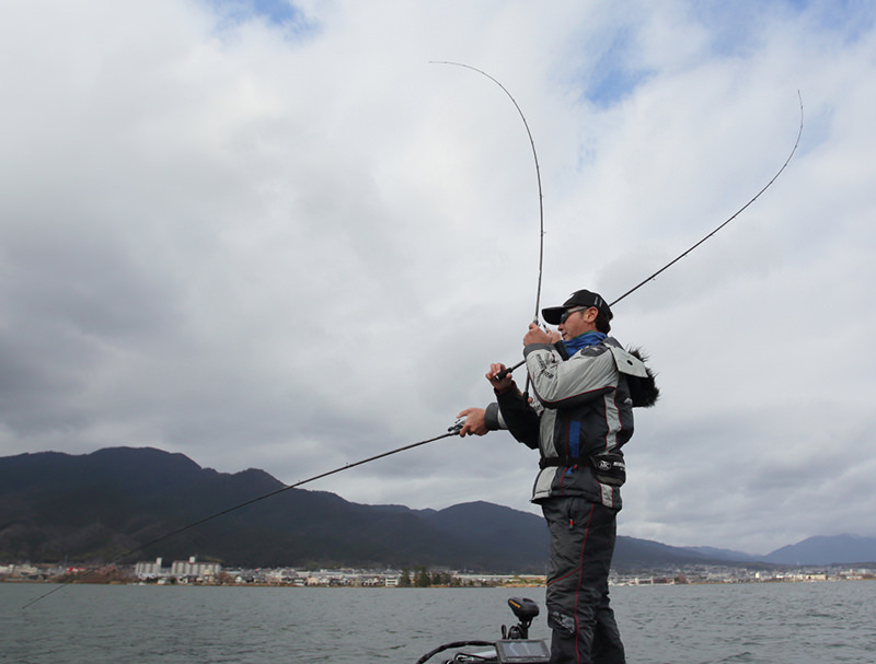 上面的照片展示了開發者的提竿技巧。他利用了一根長度為6英尺6英寸的釣竿,靠著餌的重量最大限度地發揮了竿子的彈性,以高頻率地跳躍,從而吸引魚的注意。接著,他利用金屬振動餌的高速垂直下降的特性,在餌魚掉落時以快速直線下降的方式誘發低水溫時期的黑鱸進行攻擊,從而成功地捕獲到了大量的魚