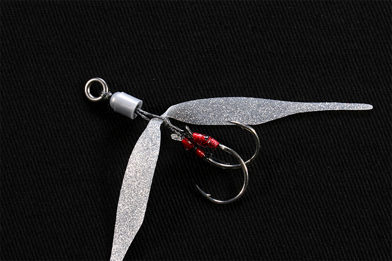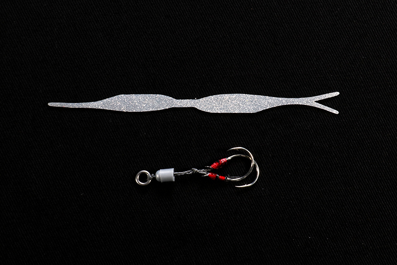 此外,Bambluz JIG系列廣為人知的特點,是搭配最適合引出餌泳型的原創魚鉤,並標配矽膠帶。矽膠帶會隨著鐵板的動作搖曳,自動吸引目標魚,同時也扮演咬鉤標記的作用。此外,根據情況可以輕鬆更換零件。