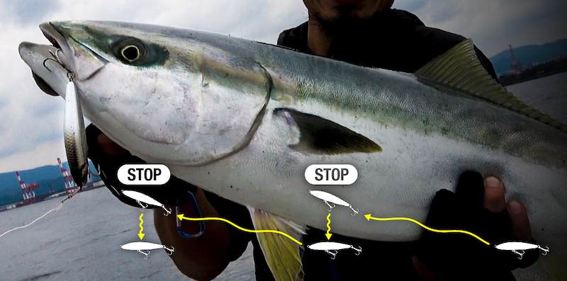 進行均速收捲,通過自然的擺動進行誘魚,停止收捲時迅速切換為顫動下落的模式,創造出誘食的時機。