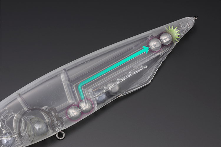敲擊聲音效應,內置發出低沉敲擊聲的單擊型響珠,可吸引大型掠食魚類,增加攻擊慾望。