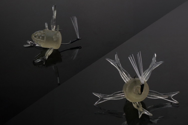 當加入快速逃脫動作時,前杯狀構造會大幅推動水流。平坦的腿部設計,會產生急劇的制動效果,使動作停止得非常明確,誘發魚隻的反應性咬鉤的重要因素。
