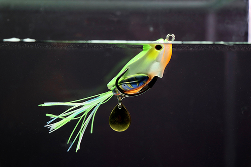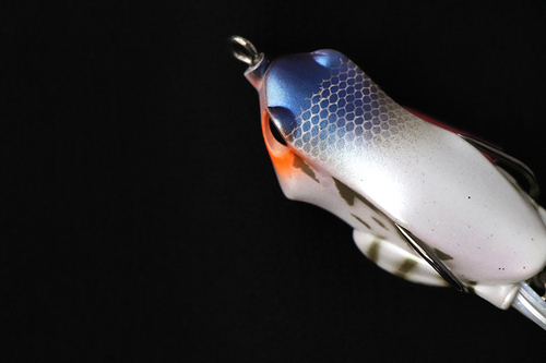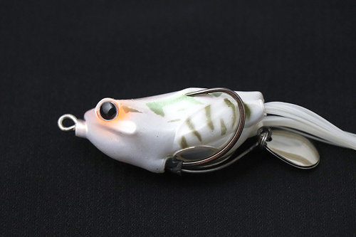 片岡專業選手對蛙餌站立姿勢的執著秘密在於後方設置的兩片小型亮片。伴隨著餌本體後方重心的增加,亮片與本體產生的刮擦聲和光線反射光相互作用,提高了此餌的吸引力。