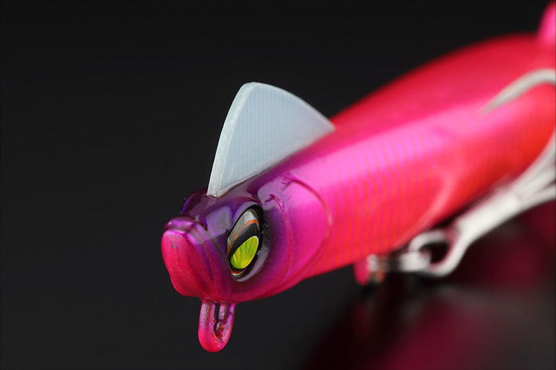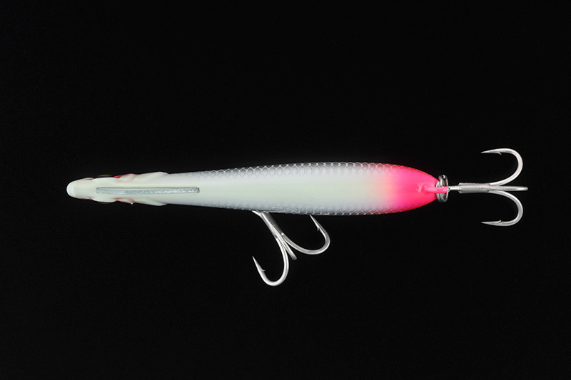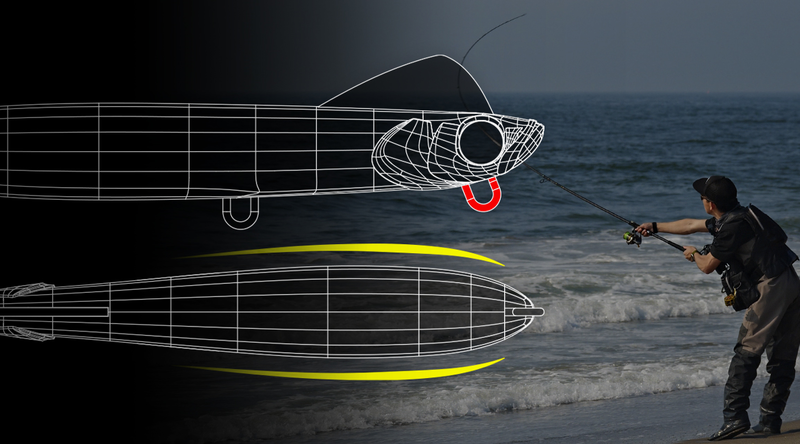 後重心設計帶來令人驚嘆的飛行距離。此外,下顎的魚線孔和低比重的鋅材質,使其在收線時適度浮起,即使在淺水區也可以舒適地使用。比鉛還要輕的材質使其能夠展現出較大的身形吸引力。