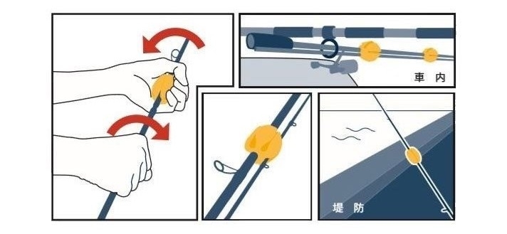 當竿節之間插得太緊轉不開, 這個蛋形的彈性體有很高的黏著力, 握在竿子上力量的傳遞不會損失, 能把竿節輕易的轉開, 而且這產品可以當束竿帶使用, 但不同於傳統的束竿帶, 釣竿之間不會互相接觸, 所以釣竿之間不會互相碰撞摩擦, 這是一個方便的工具, 可以用在多種的用途上, 在野外暫時倚靠在岸邊牆上, 因彈性體的附著力, 釣竿不容易滑動傾倒, 也能避免竿身的刮傷, 放在車上, 釣竿也比較不會互相碰撞產生噪音