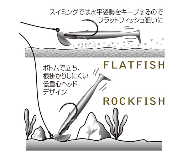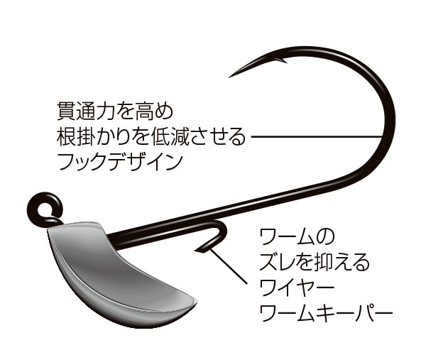 直接攻略海底的汲頭鉤, 頭部的形狀及鉤子的形狀, 不容易被卡住, 再者, 獨特的頭部形狀, 當軟蟲落下時能產生強烈的波動, 讓落下的動作更顯眼