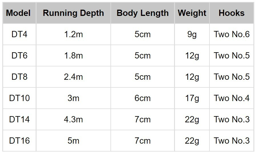 DT® (Dives-To) 胖胖魚系列, 可以快速的潛到預設的深度, 停留在該設定深度的時間比市場上任何一款胖胖魚還要久, 讓掠食者有更長的攻擊時機, 材質採用只佔7%巴爾莎木的頂級品質, 這頂級的巴爾莎木與內部的配重完美的結合一致, 漸縮的骨架和細的尾部設計, 產生出最佳的胖胖魚擺動泳姿, 絕佳的動作及深度標定的胖胖魚,只有在Rapala DT 家族