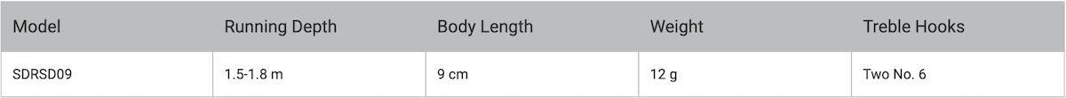 SDRSD09: 長度9cm, 重量12g, 泳深1.5~1.8m, 浮力: 緩慢上浮