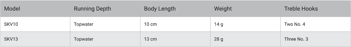 獨有設計的水表餌, 能完全的改變路亞動作的方向, V-Rap的科技結合尾部重量平衡調整, 讓釣竿的短抽就能產生急切轉向的動作, 並有很長的滑行距離