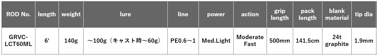 GRVC-LCT60ML 採用 24t 碳布製成的中空竿身(Tubular Blank),專注於下沉時的高靈敏度感知。