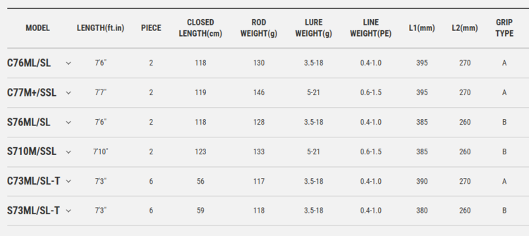所有型號均配備碳纖維實心竿尾,拋餌和紡車型號分別有長實心款和短實心款。 長實心竿尾的型號是SL型號,讓誘餌不會過度跳躍太多,專長在水中的岩石等結構周圍緩慢移動並吸引魚。