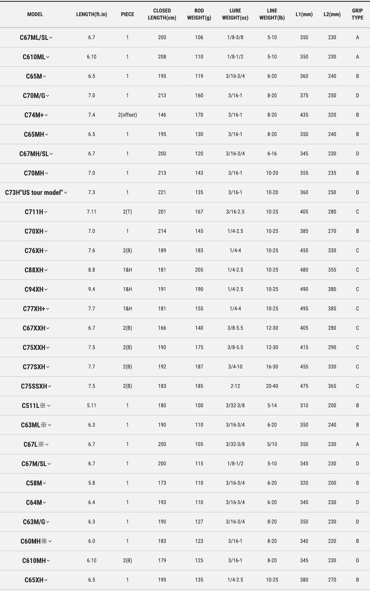 ・對應不同使用的情況, 共有六種不同的握把, 搭配適當的握把及長度以達到整把釣竿的平衡性及操作性