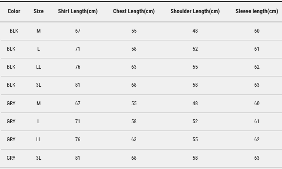 3L:長81cm / 寬68cm / 肩寬58cm / 袖長63cm