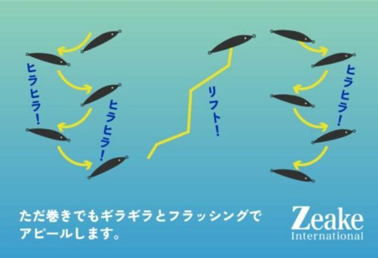 它採用了後置重心和上下非對稱的身體設計,以增加投擲距離。亞鋅合金獨特的低比重材料(比重為8.6)使得它可以緩慢下沉,在水平下沉時保持穩定,吸引目標魚!即使只是簡單地收線,它也能以輕微的擺動和閃爍的方式吸引魚。